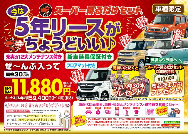新車が車検・税金・メンテナンス込み、5年間月々定額で乗れる「スーパー乗るだけセット」が、