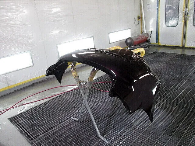 下地処理が終わればいよいよ塗装です。基本的に塗装は塗料を何回も重ねて本来の色に染めていきます。この時に使用する塗料を「カラーベース」といいます。カラーベース塗布時、最後にカラーベースをぼかすように全体になじませます。乾燥させ最後にトップコートである「クリア塗装」をします。これでツヤのある仕上がりになるんです。乾燥させて、塗ってを数回繰り返して、塗装完了です。