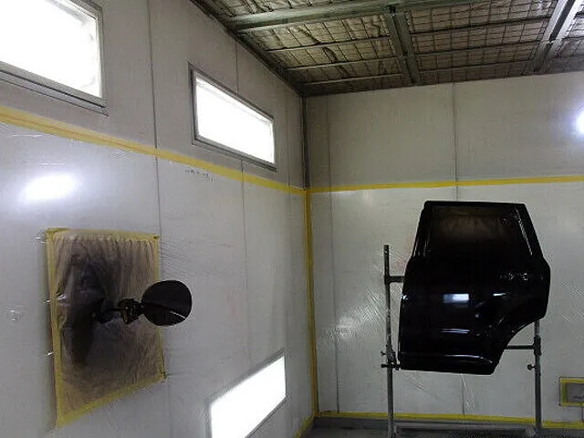 取り外したらさっそく板金・塗装で修理していきます。ヘコミ部分は叩きだし、キズは専用の研磨紙で削り落とします。研磨後はマスキングをし、下地を塗っていきます。キズや歪みがないことを確認したら、マスキングを外し乾燥させていきます。