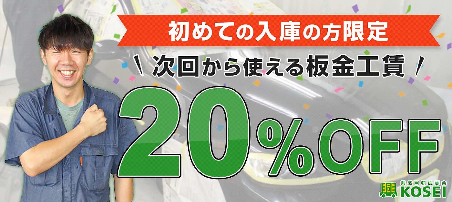 WEBからご依頼いただいた初めてのお客様限定、次回の板金工賃が20%OFFになるクーポンをプレゼント!格安で上手い板金塗装ができるチャンスをお見逃しなく。