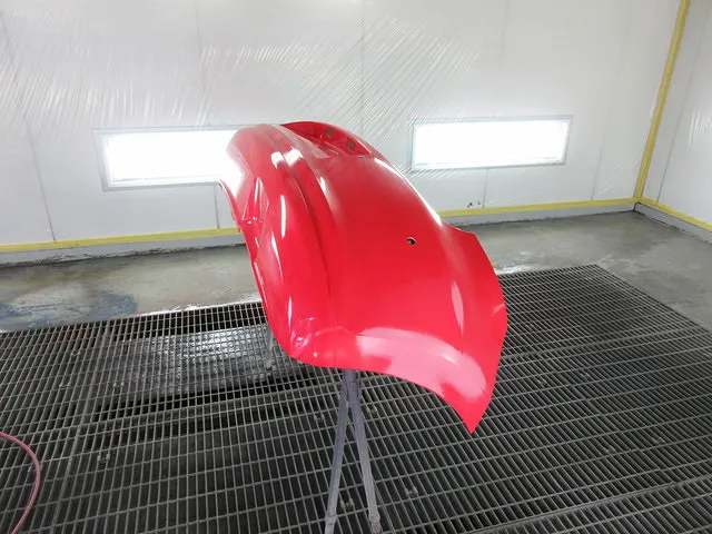 実はこのパテの作業が一番大切です。パテが下手だと仕上がり後のもちが悪かったり、見た目に違和感が残ってしまうこともあるんです。私たち板金塗装、事故修理のプロの腕の見せどころですね!パテができたら、塗装ブースでキズ跡がわからないぐらい綺麗に塗装していきます。仕上がり重視のお客様にも大満足の仕上がりでした!いつもありがとうございます。