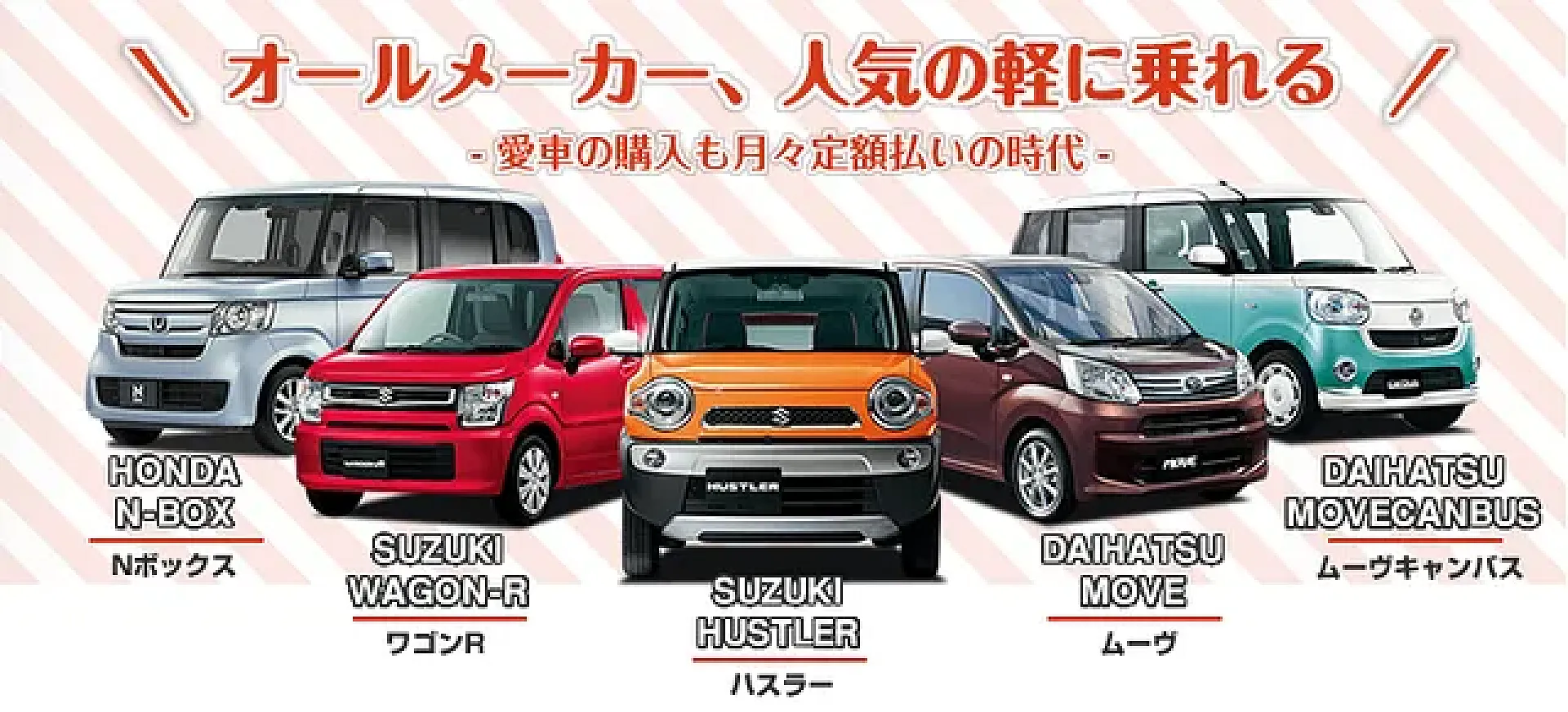 当店のカーリースは、頭金0円・月々8,640円~(税込)で国産全メーカーの人気の軽自動車に乗れちゃいます。軽トラ&軽バンのカーリースなら、さらに格安の月々3,980円!